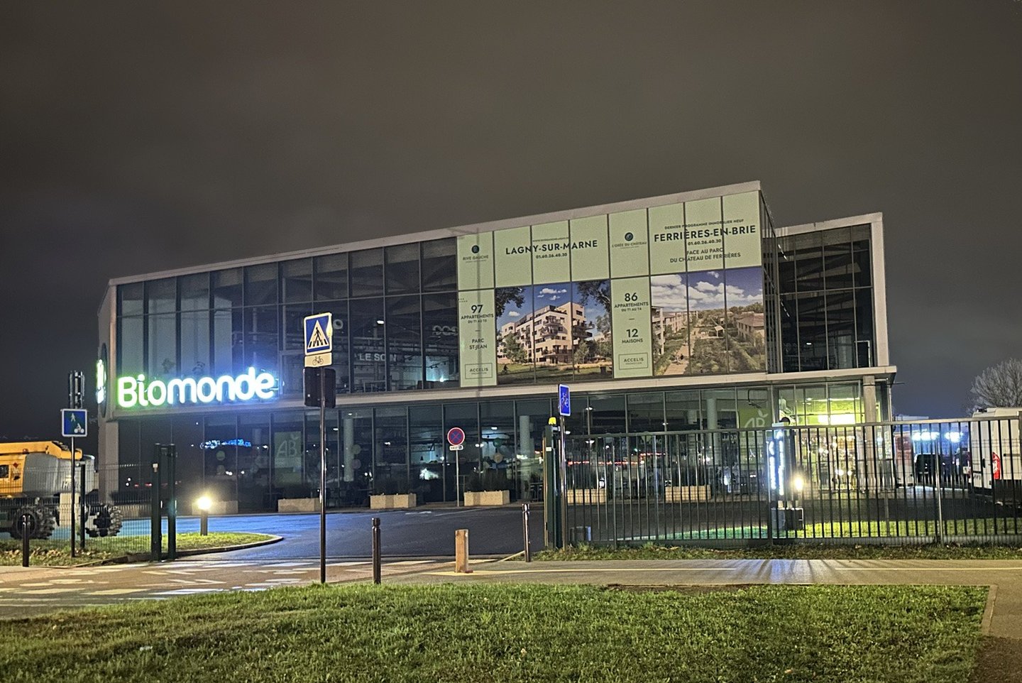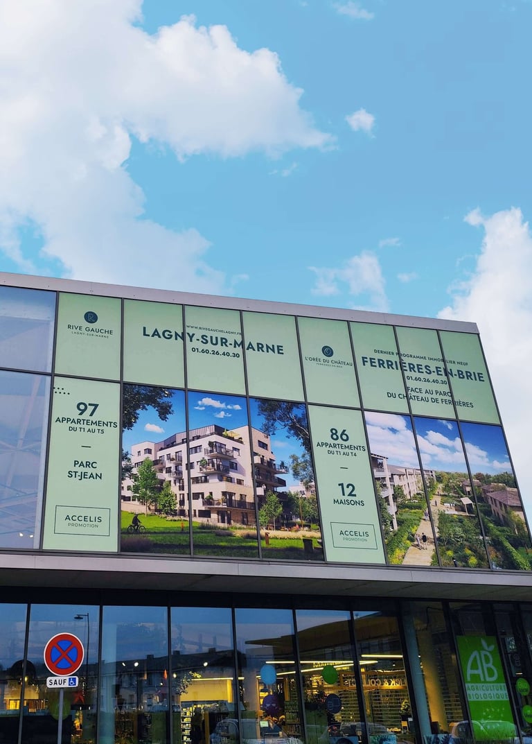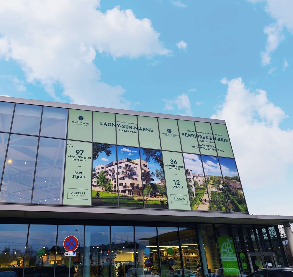 Nous avons créer la signalétique à l'intérieur du magasin car l'espace est situé dans BIO MONDE Ferrières (panneaux dibond, textiles, affiches, décoration, ameublement, installation des maquettes physiques, et stickers grands formats sur la façade du magasin